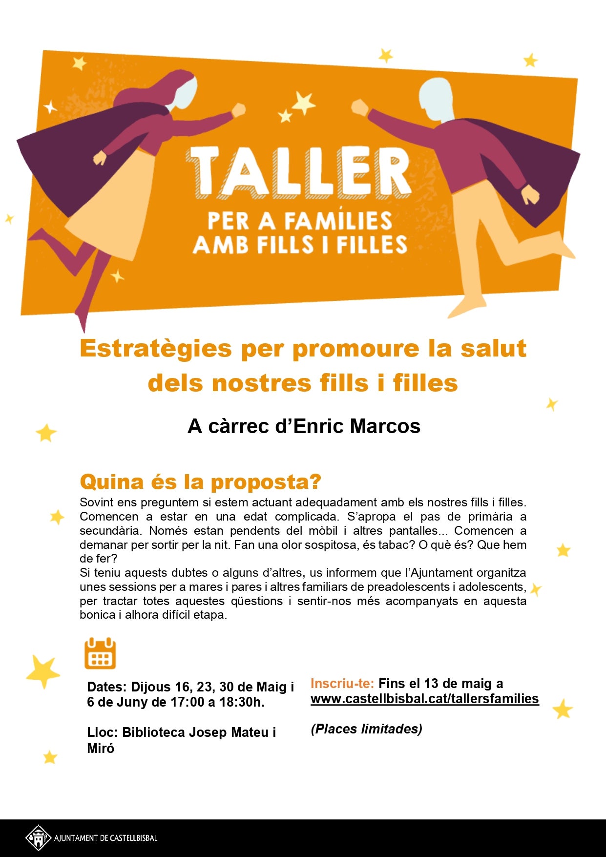 Els tallers que es realitzaran a partir del 16 de maig giraran al voltant d’un tema principal; ‘Estratègies per promoure la salut dels nostres fills i filles’. La formació anirà a càrrec d’Enric Marcos, psicòleg especialista en prevenció de conductes potencialment addictives que disposa d’una “àmplia i destacada experiència en la matèria i una gran trajectòria professional en l’acompanyament de familiars amb adolescents”, destaquen des de l’Ajuntament.