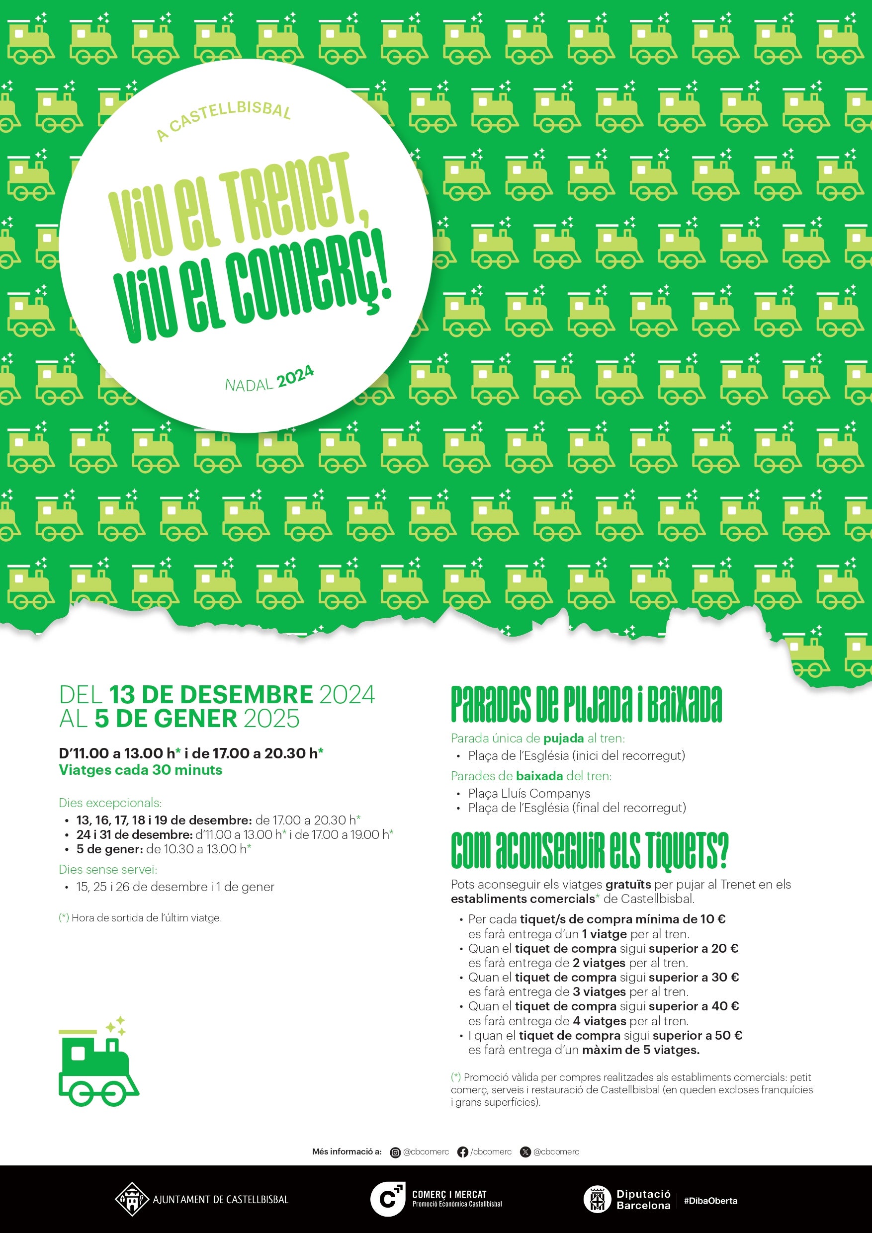 Cada any al voltant de les festes nadalenques, el Trenet de Nadal ha arribat a Castellbisbal. Així doncs, els castellbisbalencs i castellbisbalenques podran gaudir dels seus serveis fins al 5 de gener del 2025. Aquesta iniciativa, organitzada per l’Ajuntament de Castellbisbal, vol “dinamitzar els comerços i establiments de serveis locals, gaudir dels productes de la nostra terra i fomentar l’economia del nostre municipi”, expliquen des del Consistori.