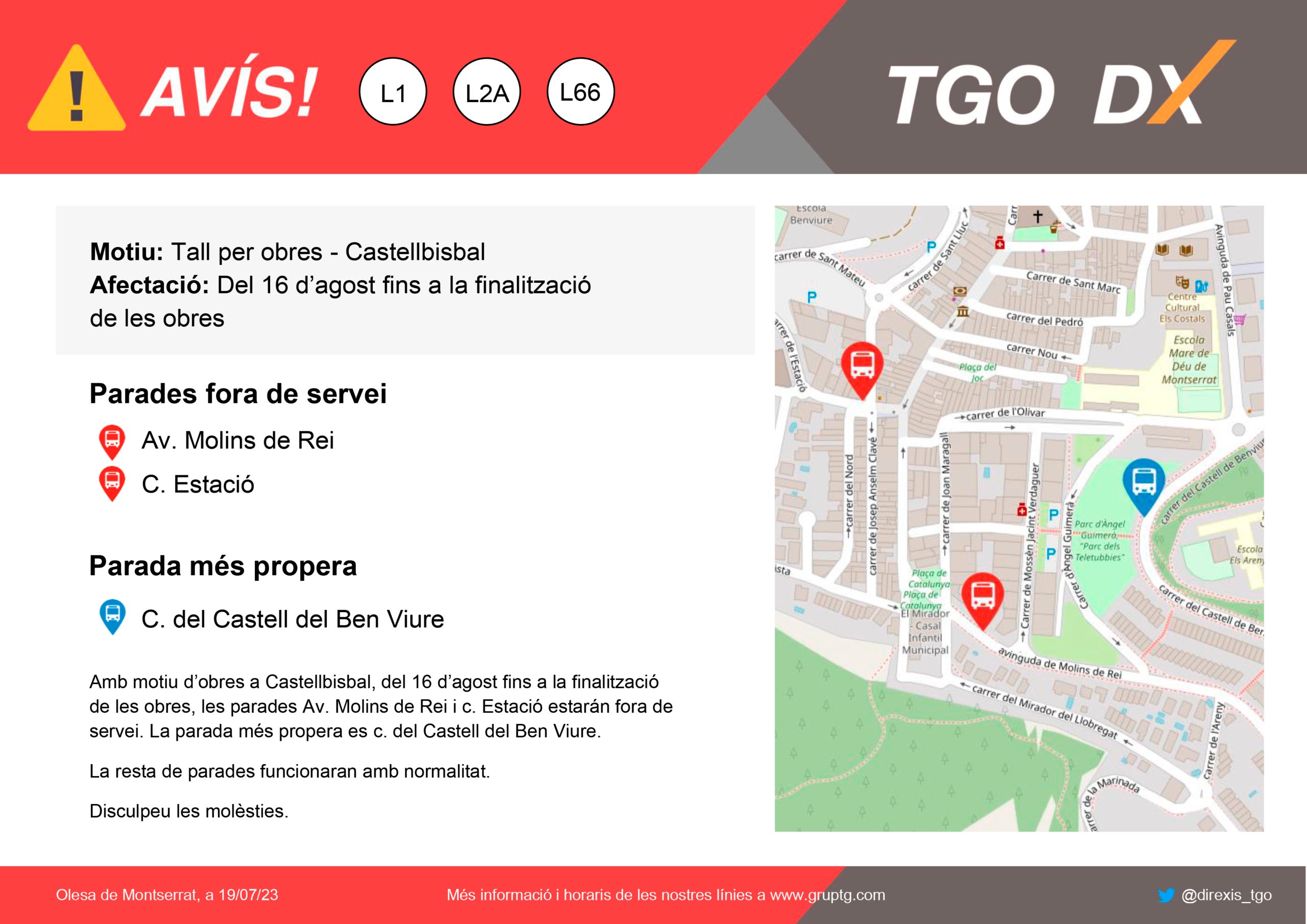 Des d’aquest passat dimecres dia 16 d’agost, TGO ha hagut de modificar alguna de les parades d’autobús de diferents línies que passen per Castellbisbal. Les línies L1 (Castellbisbal – Estació Rodalies), L2A (Castellbisbal-bus urbà Costa Blanca i Can Santeugini) i L66 (Castellbisbal-Sant Andreu de la Barca) s’han vist afectades per l’inici d’unes obres que s’allargaran uns quants dies, sense una data de finalització estipulada en el calendari.