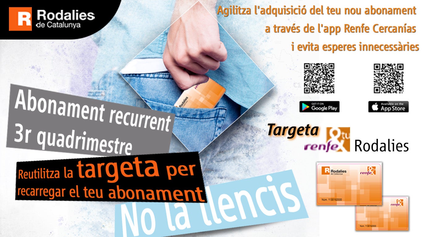 Finalment, com a novetat, els clients que disposin de la targeta Renfe@tu, que ha estat implantada el quadrimestre anterior, la poden reutilitzar per recarregar el nou abonament o agilitzar-ne l’adquisició a través de l’app Renfe Cercanías. Amb aquesta opció l’usuari pot tenir els dos abonaments, el del quadrimestre en curs i el darrer de l’any, en el mateix suport.