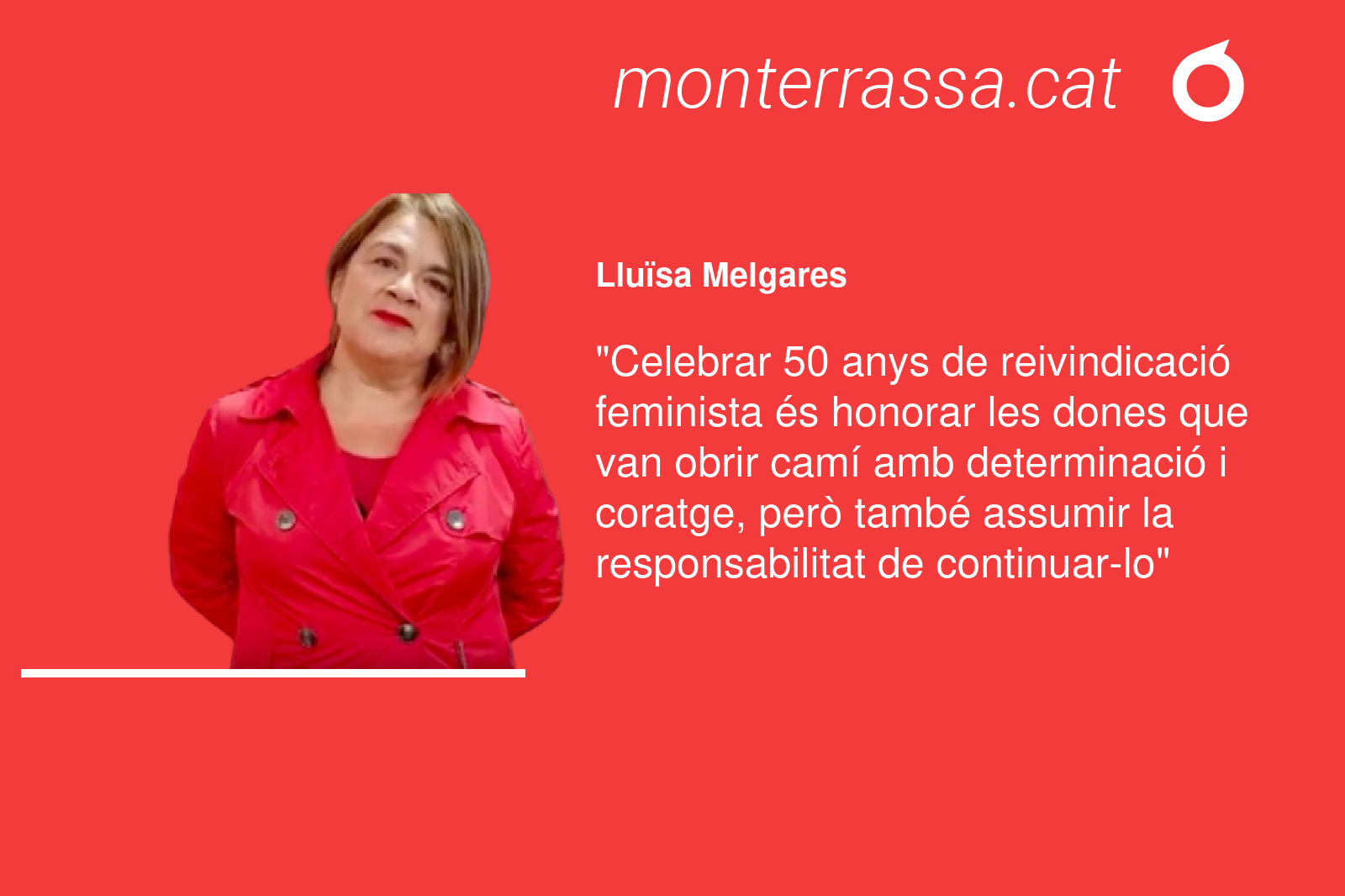Celebrar cinquanta anys de reivindicació feminista és honorar les dones que van obrir camí amb determinació i coratge, però també assumir, com a generació present, la responsabilitat de continuar-ho. Les dones més joves han recollit el testimoni de les generacions precedents i impulsen la lluita amb la mateixa força, convicció i rigor. El seu compromís manté viva la reivindicació feminista i ens recorda que no permetrem cap retrocés en els drets i la igualtat que tant ha costat assolir, i que continuarem defensant plegades.