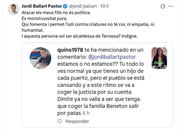 Ballart s’ha enfurismat davant del “comentari fastigós” i ha recordat que no es tracta “d’una excepció. És el reflex d’un espai on l’odi es fomenta, es tolera i s’alimenta de manera reiterada. Un odi que ha anat fins al punt d’atacar els meus fills. Nens petits. Criatures innocents”, ha manifestat.