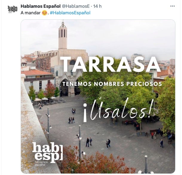 Aquesta setmana, el nou intent arriba des de l’entitat Hablamos Español que ha iniciat una acció per visibilitzar “els topònims en espanyol que es volen exterminar”. Entre els diferents cartells que fan circular hi trobem el de “Tarrasa”, sota el lema “Tenim noms preciosos, utilitzem-los”, amb una imatge de la plaça Vella per il·lustrar-ho. Amb coneixement o no, han escollit justament un espai que justament durant l’època franquista es deia Plaza de España.