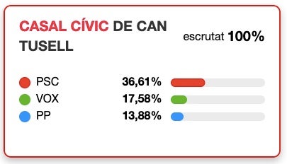 El PSC es planta a Can Tusell amb el 36,61% dels vots, a una distància considerable de la segona força, VOX, amb 17,58%. La diferència de vots entre les dues forces ha estat de 170. Menor diferència hi ha amb el Partit Popular, que completa el podi, amb un 13,88% i 124 vots. A partir d’aquí venen els partits catalanistes amb ERC al capdavant fregant el 10% i quedant-se amb 88 vots. Molt més enrere hi ha Comuns Sumar amb 58 vots (6,5%), Junts amb 45 vots (5%) i CUP, amb 19 vots (2%). Ciutadans i Pacma empaten a 17 vots mentre que Aliança Catalana es queda amb 13.