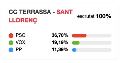 El Districte 6 de Terrassa està format per nou col·legis electorals distribuïts en els barris Sant Pere Nord, Ègara, Les Arenes-La Grípia-Can Montllor, Sant Llorenç, Can Tusell i la Font de l’Espardenyera. Victòria socialista inapal·lable en tots els col·legis, tot i que el més destacable és que és, sens dubte, el major feu de VOX de la ciutat. Només en un dels espais de votació no ha estat la segona força, a l’escola La Nova Electra, on Junts i ERC s’han disputat el podi. A tota la resta, a més de VOX, la tercera força ha estat el Partit Popular.