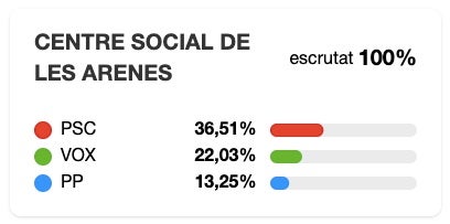 Els tres col·legis ubicats a Les Arenés és on es concentra el major precentatge de VOX. Tanmateix, el PSC continua sent l’opció favorita per als votants. Al Centre Social un 36,5% va optar per votar el partit de Salvador Illa mentre que un 22% ho va fer per Abascal. Traslladat en vots això vol dir 628 vermells per 379 de verds. En tercera posició, el calaix va ser per al PP, amb un diferenciat 13,2% i 228 vots. Ja més avall trobem com a quarta força ERC amb un 9% dels vots emesos (156) i, també superant el centenar de vots, Comuns Sumar. Junts, amb 65, Pacma, amb 39, Aliança, amb 32, i CUP amb 30, tanquen els partits més destacats.