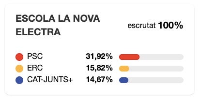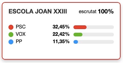 Si hi ha un col·legi electoral on VOX pugui plantar cara (relativament) al PSC és en aquest. A l’escola Joan XXII, el partot de Santiago Abascal es queda a “només” 10 punts de Salvador Illa. Amb un 32,45% dels vots, els socialistes es distancien dels verds gràcies a una diferència de 144 vots. Ja molt més endarrerit hi ha el Partit Popular, amb un 11% i 163 vots. Trepitjant-li els talons s’hi troba ERC, amb un 10,5% i 152 vots. Comuns Sumar també supera el centenar de vots (102) mentre que Junts no arriba al 5%. Aliança Catalana i la CUP sumen una trentena de vots cadascun.