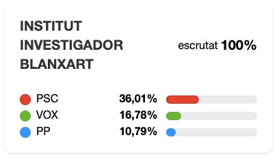 A l’Institut Investigador Blanxart el PSC no té rival. Un total de 20 punts de diferència és insalvable per a qualsevol. Assoleix el 36% dels vots emesos, i recull 457 vots. En segona posició hi ha VOX, on el partit d’Abascal es guanya la confiança de 213 votants (un 16,8% del cens). En tercera posició, hi ha el Partit Popular, amb 10,8% i 137 vots. Com passa en la majoria de col·legis electorals del districte és ERC qui es queda la quarta posició, aquí molt i molt a prop del PP amb 132 vots. Junts, cinquena, amb 119 vots. Ja per sota, trobem Comuns Sumar (69), CUP (31) i Aliança Catalana (25).