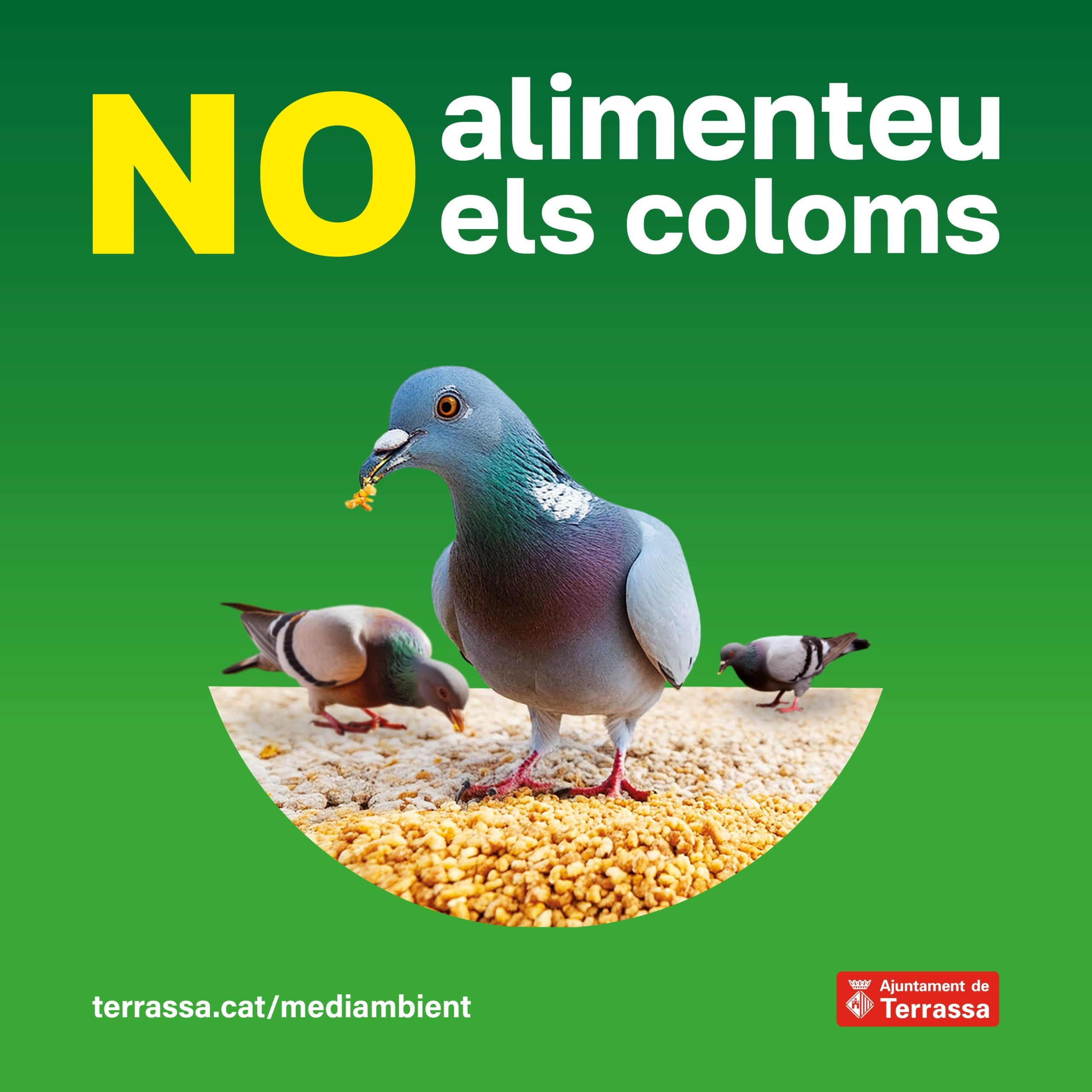Més informació i sancions per evitar que els egarencs alimentin els coloms. Amb aquest objectiu, l’Ajuntament de Terrassa ha iniciat aquesta setmana una nova campanya que porta per títol un missatge ben clar: “No alimenteu els coloms”. La ciutat es troba que hi ha una sobre població d’aquestes aus urbanes, les quals ja es titllen de “plaga”. Justament, en el darrer ple municipal, es va aprovar per unanimitat una proposta de resolució presentada pel PP que anava destinada a incrementar les mesures contra les “plagues” a la ciutat.
