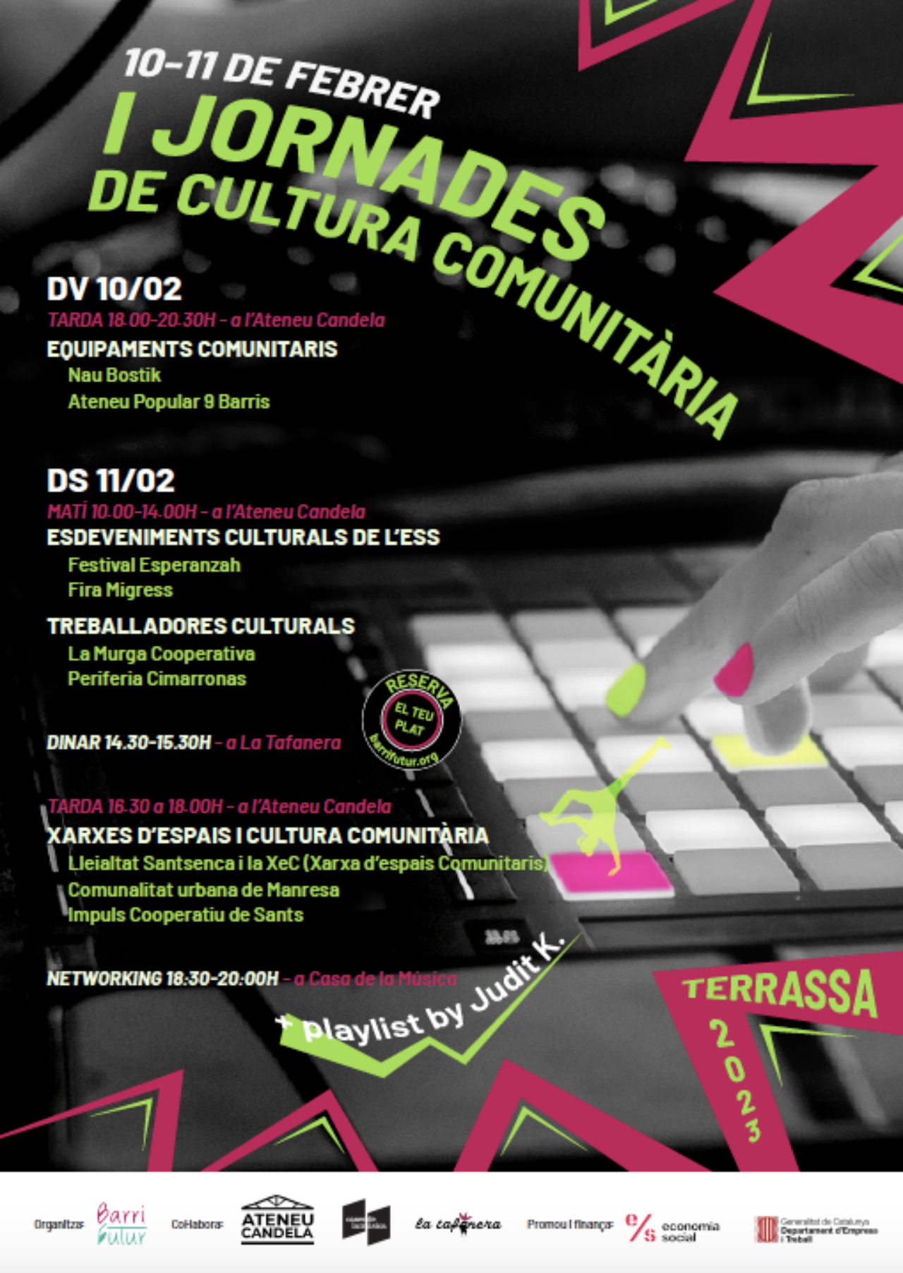 El projecte terrassenc per fomentar l’economia social, solidària i cooperativisme, Barri Futur, organitza les I Jornades de Cultura Comunitària a Terrassa. Aquestes jornades, que volen aportar “solucions a les necessitats del territori garantint una cultura comunitària que sigui lliure, antiracista i transfeminista”, se celebraran els dies 10 i 11 de febrer a tres locals diferents: al Centre Social Ateneu Candela, el Casal Popular La Tafanera, i la Casa de la Música de Terrassa.