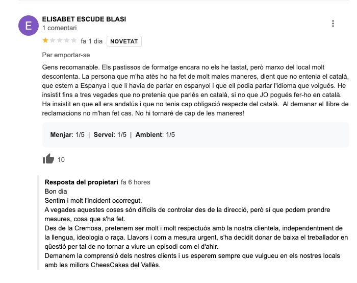 En les darreres hores, el compte de Google de La Cremosa s’ha omplert de valoracions negatives queixant-se de la manca de sensibilització amb la llengua pròpia del país. En totes i cadascuna d’elles, l’establiment ha contestat demanant disculpes i explicant que s’han pres mesures perquè no torni a passar.