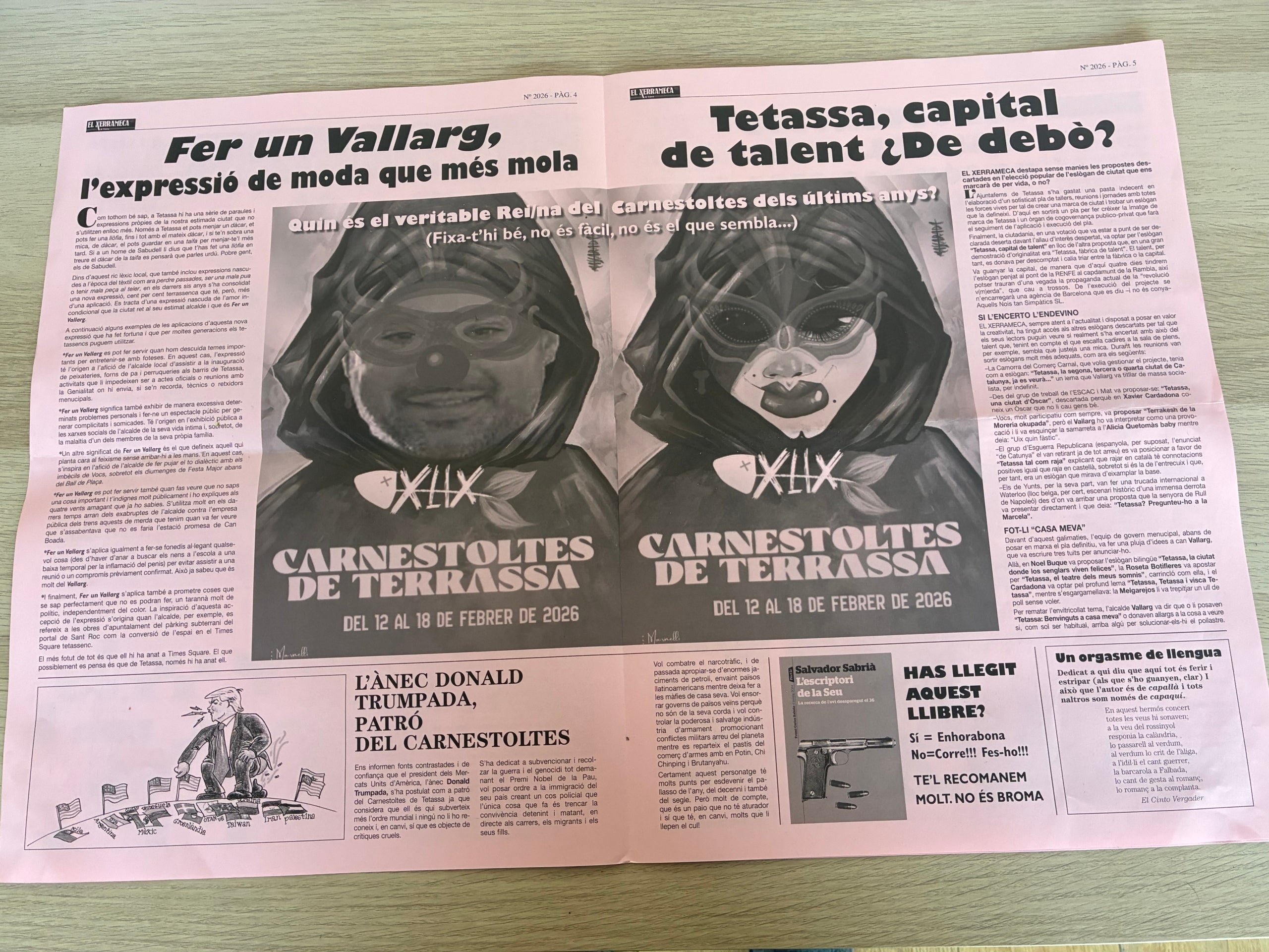 També hi ha lloc per a parlar del gir cap a posicions ultracatòliques de l’escola El Karmel, segons denuncien part dels pares d’alumnes, amb l’article Les joventuts karmelianes no són pas cosa del passat; per a qüestionar si Terrassa és una veritable ciutat de cinema; per a una curiosa història de la Moreneta que fuig de Montserrat per la visita de Felip VI i Leticia i acaba deportada amb el seu fill a Mèxic després de passar per Minneapolis; per a un altre presumpte escàndol dels papers del depredador de noies Epstein que passa per reclutar octogenàries en parròquies locals; i per a un Donald Trump que s’acaba convertit en el patró del Carnestoltes terrassenc.