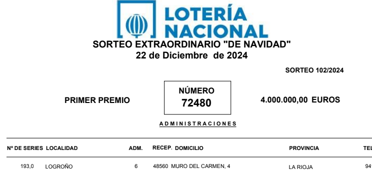 El Gordo de la Loteria de Nadal ja ha sortit, a les 11.29, i correspon al número 72480. Ha caigut íntegrament a Logronyo, i ha passat de llarg de Terrassa.