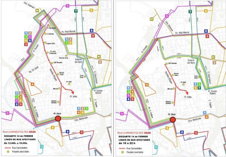 El dissabte 14, de 15 a 22 h, els autobusos de les línies L1 (St. Llorenç-Hospital), L2 (Les Arenes-Rambla d’Ègara), L3 (La Grípia-La Maurina), L5 (Can Trias-Can Roca), L6 (La Cogullada-Can Roca), L8 i L9 (Avingudes) accediran a les parades provisionals de la carretera de Martorell pels barris del Poble Nou i Can Boada, la ronda de Ponent i l’avinguda d’Àngel Sallent. Els autobusos de les línies L2 (direcció Les Arenes), L3 (direcció La Grípia) i L6 (direcció Can Roca) també circularan per la carretera de Montcada i el carrer de Topete. I de 19 a 22 h, els autobusos de les línies L1, L2, L3 i L6 circularan pel passeig del Vint-i-dos de Juliol, l’avinguda de Josep Tarradellas, la ronda de Ponent i l’avinguda d’Àngel Sallent.