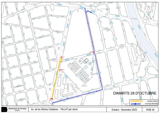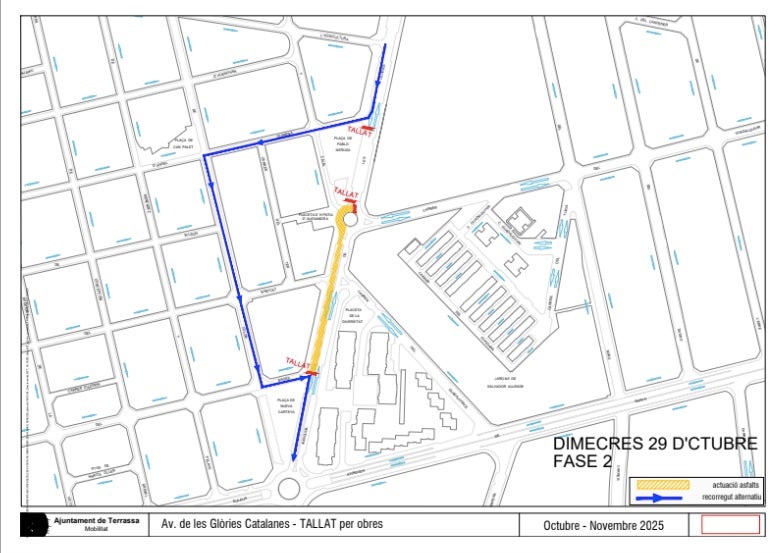 El Servei de Mobilitat de l’Ajuntament de Terrassa informa que a partir del proper dilluns 27 i fins al dijous 30 d’octubre, l’avinguda de les Glòries Catalanes, entre el carrer Guadalquivir i l’avinguda Santa Eulàlia, i les rotondes corresponents es veuran afectades al trànsit. Es tracta d’obres emmarcades dins del projecte de millora de l’asfaltat als carrers de la ciutat.
