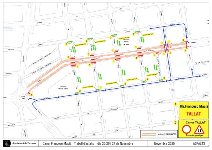 Setmana d’obres a la rambla de Francesc Macià de Terrassa. L’eix central del barri de Sant Pere Nord viurà del 24 al 28 de novembre una actuació intensiva de reposició del paviment asfàltic. Aquesta intervenció forma part del Pla impulsat des de l’Ajuntament de Terrassa de millora de l’asfaltatge als carrers i vies de la ciutat. “Es millorarà sensiblement la rambla de Francesc Macià i posarà al dia una artèria tan important del barri i de la ciutat. Seguim així amb el nostre objectiu de dignificar i modernitzar els paviments de la ciutat per millorar la qualitat de vida de la ciutadania”, ha manifestat la regidora de Manteniment i Obres Públiques, Montserrat Alba,