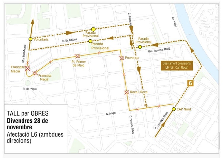 Tall de trànsit de la cruïlla del carrer de Pompeu Fabra i els dos vials de la rambla de Francesc Macià. Els autobusos de la L6, direcció la Cogullada, es desviaran pel carrer de Roig Ventura i creuaran la rambla pel carrer de Provença. Es senyalitzarà una parada provisional entre els carrers de Girona i Doctor Ferran. Els autobusos de la L6, direcció Can Roca, es desviaran pel carrer del Doctor Cardús, l’avinguda de Jaume I i la carretera de Matadepera.