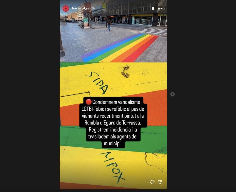 Pintada LGTBi-fòbica en un pas de vianants irisat de Terrassa. Des de l’Observatori contra la LGTBI-fòbia de Catalunya han denunciat l’aparició d’unes paraules ofensives dins de la bandera de Sant Martí ubicada a la Rambla d’Ègara, a tocar de l’estació de Ferrocarrils de la Generalitat de Catalunya (FGC). Aquest dilluns al matí, dia 16 de març, les dues paraules gargotejades en una de les tires de colors eren ben visibles i ressaltaven. En una posa: SIDA, en majúscules. En l’altre: MPOX, és a dir, la malaltia infecciosa coneguda com la verola del mico.