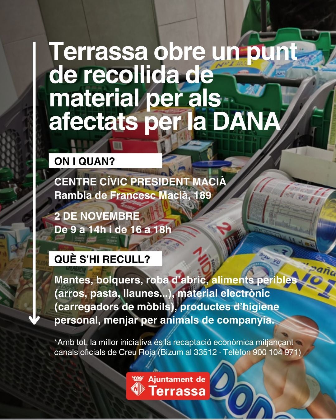 Terrassa obrirà demà 2 de novembre un punt de recollida de materials per a les persones afectades per la Dana, que ha arrasat diverses comunitats, amb especial afectació a la Comunitat Valenciana, Castella – La Manxa i Andalusia.