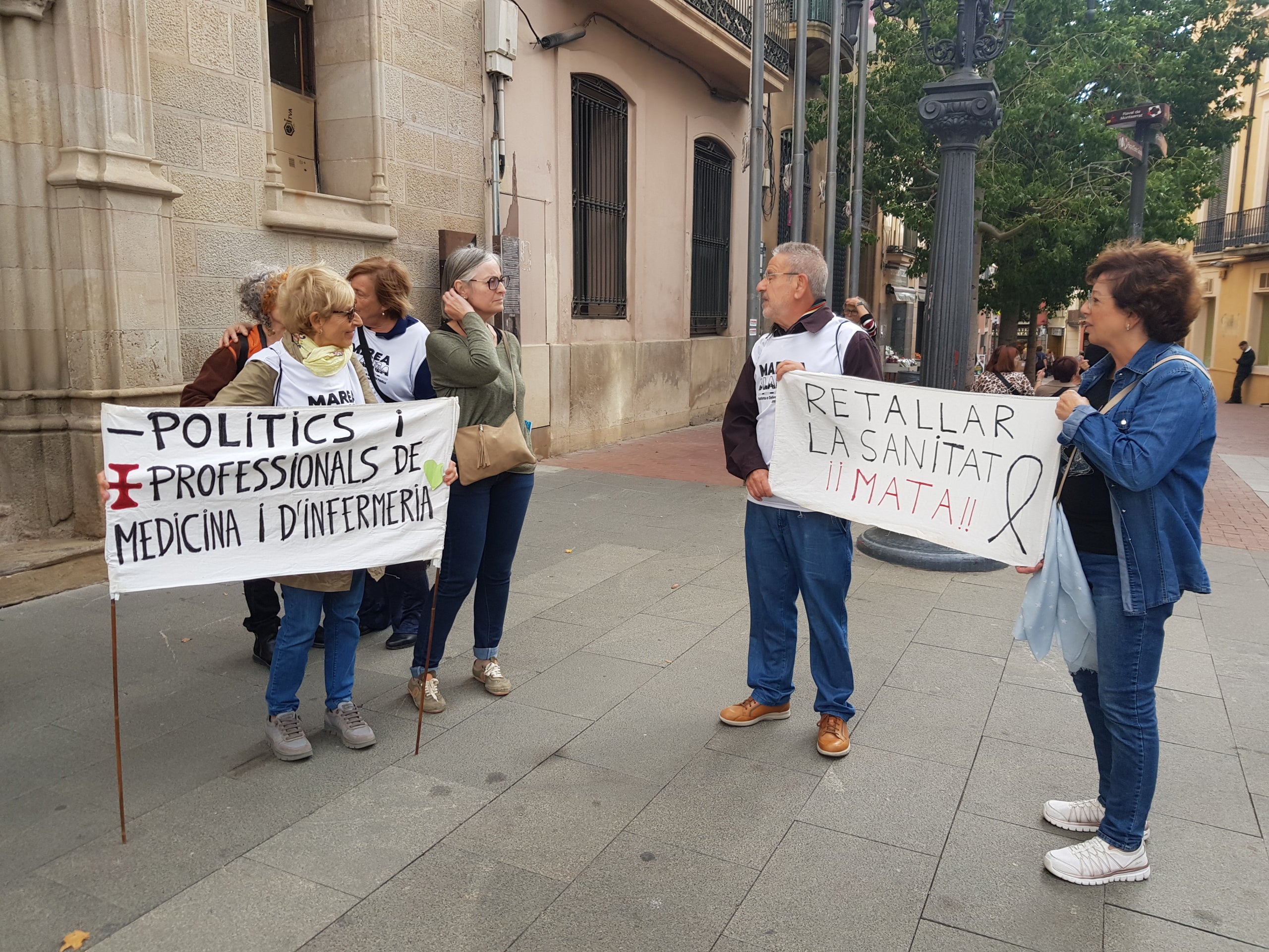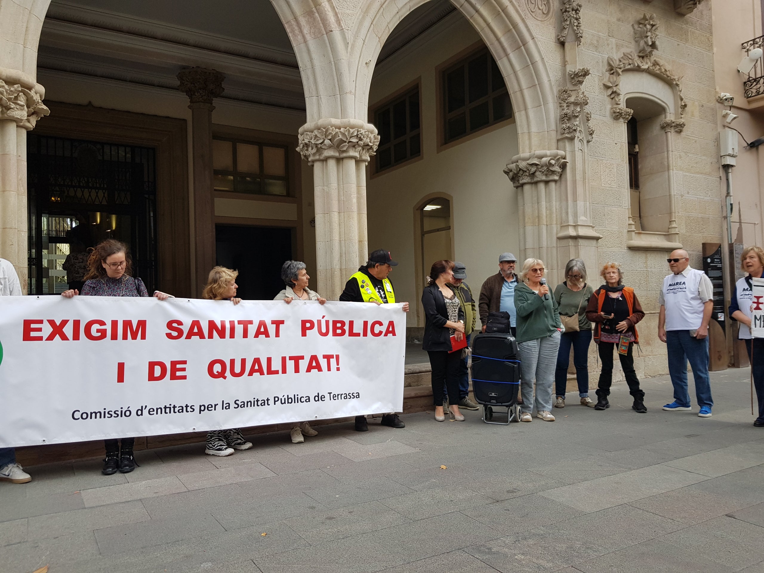 En la concentració, també hi havia Victoria Ortega, professional sanitària a Terrassa, que ha recalcat que “el que vosaltres com a usuaris patiu com a necessitat, nosaltres ho patim com a mancança. No calen tantes reunions i estudis i mirar i remirar, el que necessitem és més mans i millors espais on es pugui atendre els malalts amb dignitat i privacitat”. La sanitària ha posat èmfasi en què cal reduir ràtios, “hi ha investigacions científiques que demostren que una infermera, per exemple, pot portar com a màxim set pacients, que a partir d’aquesta xifra, això suposa risc de mort. Doncs bé, actualment, en determinades franges horàries i plantes, les infermeres estem portant fins a divuit malalts. I no parlem del sociosanitari, que poden ser més de vint”.