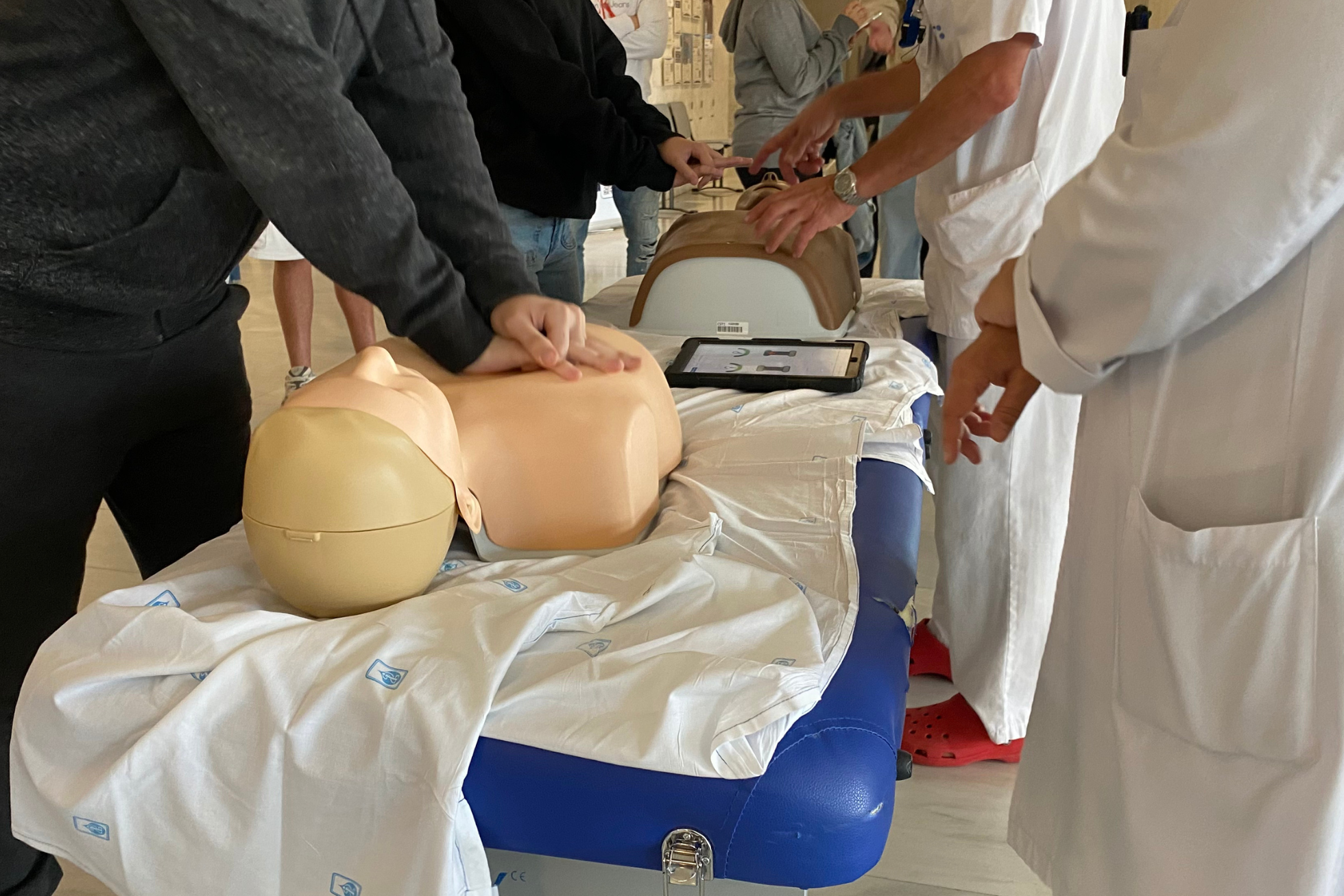L’espai de simulació ha consistit, en primer lloc, en una formació sobre la importància de les compressions toràciques en la reanimació cardiopulmonar. Perquè els usuaris i estudiants poguessin veure com es feia, s’ha repassat la tècnica per a fer-les: s’ha de col·locar les mans al centre del pit comprimint el pit uns 5-6 cm. a un ritme de 100-120 compressions per minut. Finalment, una de les parts més divertides, ha estat la cursa, on els participants han fet una competició de compressions toràciques i han pogut visualitzar la seva progressió en una pantalla, a mode de cursa.