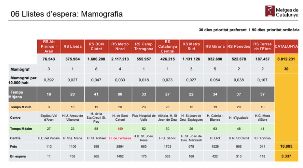 Metges de Catalunya (MC) alerta sobre la “profunda desigualtat territorial” en l’accés als serveis sanitaris, la qual es plasma, per exemple, en el temps d’espera per accedir a proves diagnòstiques. A la zona Metropolitana Nord, els pacients poden esperar fins a 185 dies per a una ressonància magnètica o 294 dies per a una endoscòpia digestiva. També és qui més llista d’espera té en colonoscòpies (124 dies) o en esofagogastroscòpies, amb 162 dies de mitjana. Malgrat que les proves d’imatge, TAC, RNM i mamografies tenen menys de 90 dies d’espera, curiosament, és aquest àmbit on surt assenyalat (per mal) un centre hospitalari de la nostra ciutat, en comparativa amb la resta de la regió. En la resta de taules comparatives, l’Hospital Universitari de Terrassa no surt destacat (ni com a temps mínim o màxim), essent l’Hospital Parc Taulí qui encapçala la majoria dels rànquings negatius.