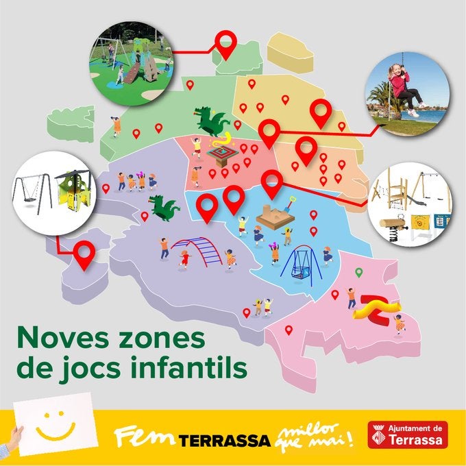 L’Ajuntament de Terrassa ha començat els treballs per millorar àrees de jocs de diferents zones infantils de la ciutat i incloure-hi nous jocs inclusius i de més varietat lúdica. Els treballs afectaran a vuit espais de joc repartits per la ciutat i està previst que acabin a finals de novembre d’enguany. El pressupost per aquestes obres és de gairebé 228.000 euros, concretament 227.745,53€.