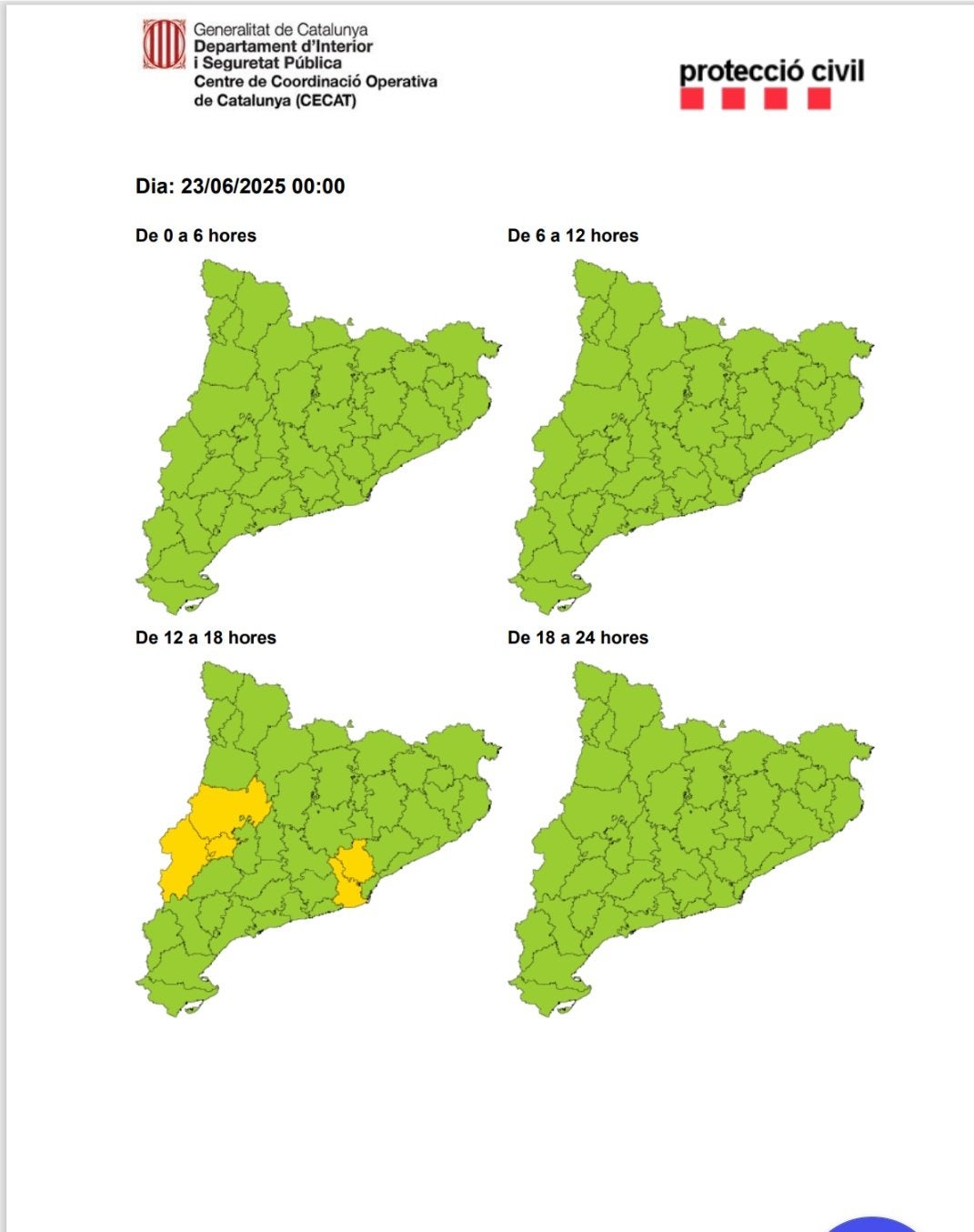 Terrassa bullirà aquest dilluns dia 23 de juny. El Departament d’Interior i Seguretat Pública ha emès un avís per calor intensa que afectarà la comarca del Vallès Occidental i Baix Llobregat, a més de tres comarques més de Ponent. Segons informa Protecció Civil de Terrassa, la franja horària de major afectació a casa nostra serà entre les dues del migdia (14 hores) i les vuit del vespre (20 hores). El nivell de perill és d’1 sobre 6, segons preveu el Servei Meteorològic de Catalunya.