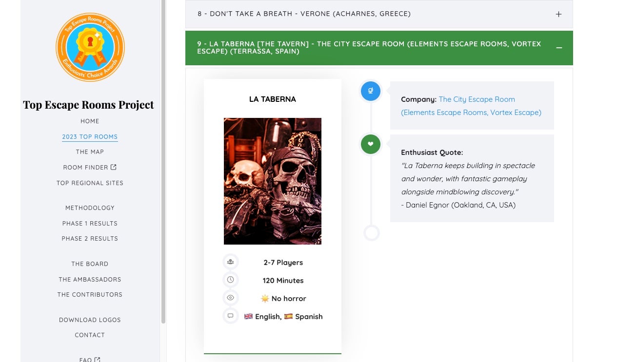 I si mirem quines son les altres vuit que té al davant, veurem que és la primera sala de Catalunya i de l’Estat. No és una cosa menor, perquè en aquests guardons hi han participat un total de 314.782 Escape Rooms, de les quals 939 han quedat nominades i només 100 han resultat seleccionades en el llistat final. Així, La Taberna -que té la ubicació al carrer Llobregat, 4B, Local 11- s’ha col·locat en el TOP10 gràcies a un espectacle únic i terriblement divertit. Només ha estat superada per Molly’s Game (neerlandesa), The Dome (neerlandesa), Chapel&Catacombs (grega), La Cathédrale Oubliéé (canadenca), De Wraak Van Han (belga), Opuszczony Hotel (polonesa), Armoire à Vendre (canadenca) i Don’t Take a Breath (grega).