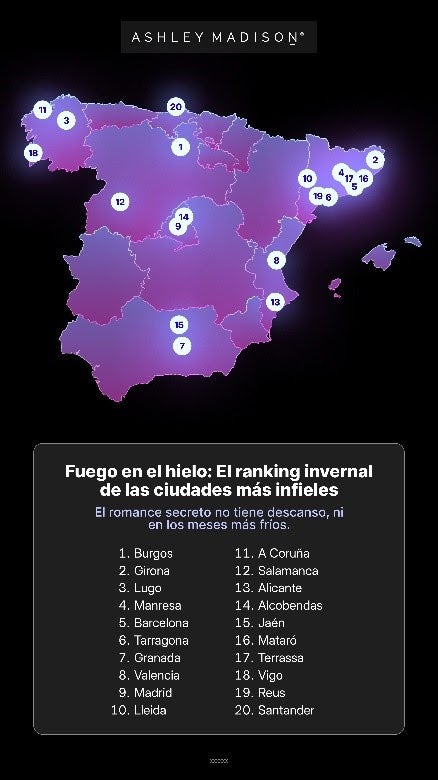 Des de l’empresa destaquen que Catalunya és una de les comunitats amb més infidels potencials o consumats. Fins a vuit ciutats tenim en el rànquing hivernal. Christoph Kraemer, director general d’Europa d’Ashley Madison, afirma que aquest fenomen podria atribuir-se a “un entorn social més obert, que permet a les persones explorar noves formes de connexió emocional i sexual. “Catalunya continua liderant com a referent en l’evolució de les dinàmiques de parelles de tot Espanya. La diversitat cultural i l’acceptació d’estils de vida alternatius permeten que les persones se sentin més lliures per buscar noves experiències”, argumenta.