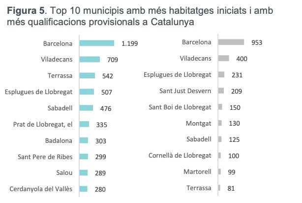 Malgrat tot, és la segona comarca amb més obra nova iniciada, només per darrere del Baix Llobregat, que ella sí que continua pujant. La dinàmica és negativa al Vallès, també per a Terrassa. La cocapital vallesana es troba en tercera posició catalana amb més habitatges iniciats el 2025, amb un total de 542, el que representa un 23% del còmput comarcal (2.393) i on la gran majoria es troben concentrats en el darrer trimestre de l’any (435). Només ha estat superada per Barcelona (1.199 visats) i Viladecans (709), i es troba lleugerament per davant d’Esplugues de Llobregat (507) i Sabadell (476). Malgrat això, cal tenir present que el 2024, Terrassa va registrar 669 habitatges de nova construcció. Per tant, s’ha produït un descens comparatiu del 19%. A Sabadell, el descens anual ha estat superior al 8%.