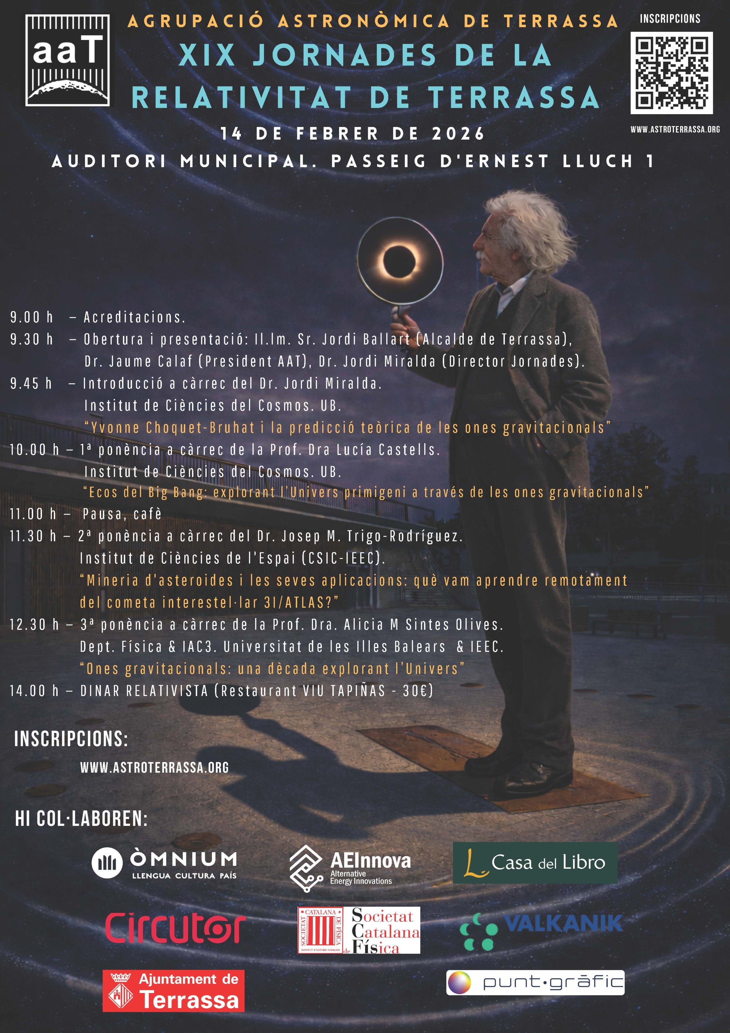 Aquest dissabte, dia 14 de febrer, tindrà lloc la XIX Jornades de la Relativitat de Terrassa. Organitzada des de l’any 2008 per l’Agrupació Astronòmica de Terrassa i amb el suport de l’Ajuntament, aquest esdeveniment busca commemorar la visita a la nostra ciutat que va fer l’autor de la Teoria de la Relativitat, Albert Einstein, acompanyat per Josep Puig i Cadafalch el 26 de febrer de l’any 1923. En aquesta jornada s’apropa la ciència a la societat i es posa l’accent especialment en la física, tot destacant la importància de la ciència i el coneixement pel futur de la nostra societat.