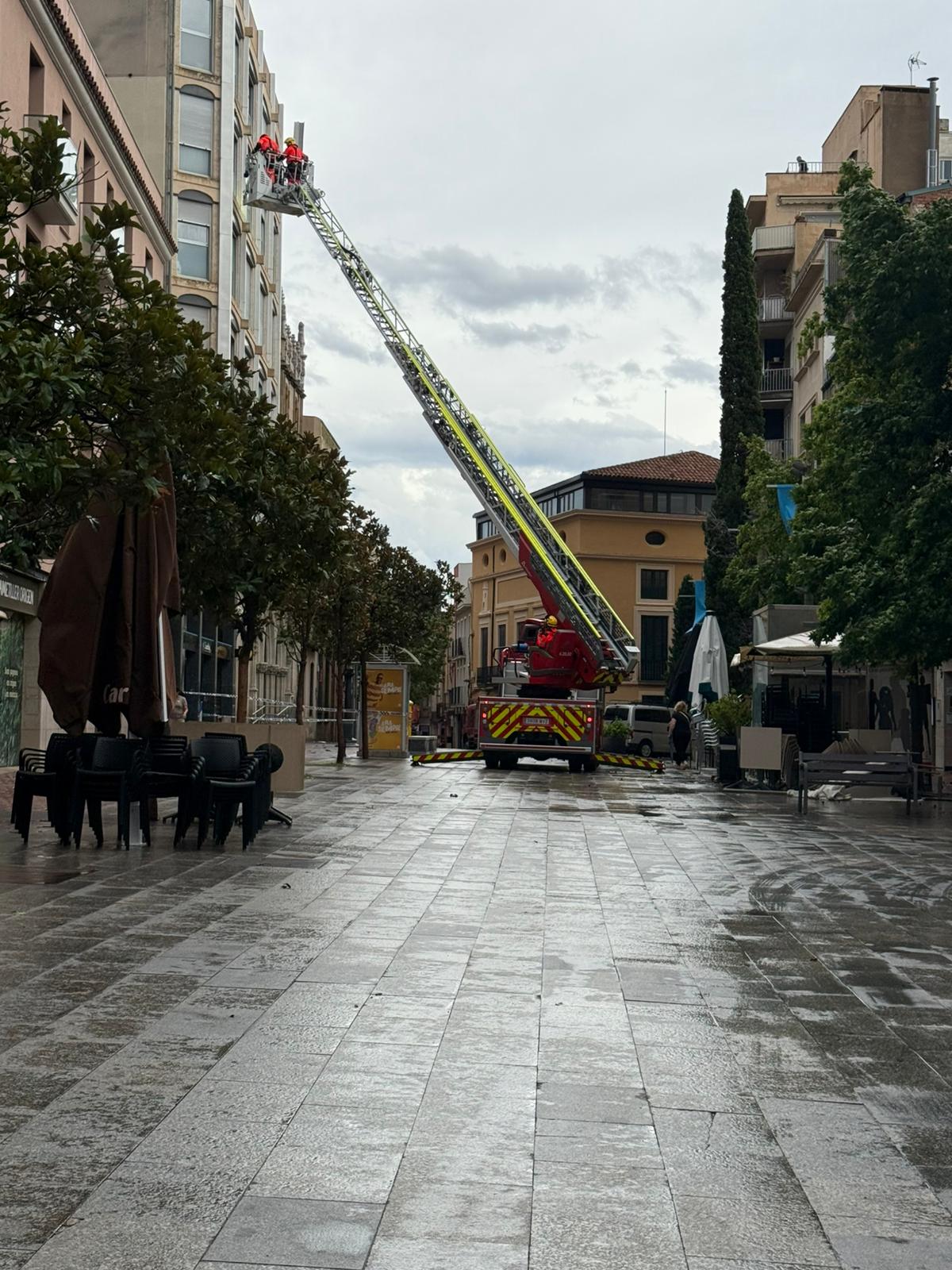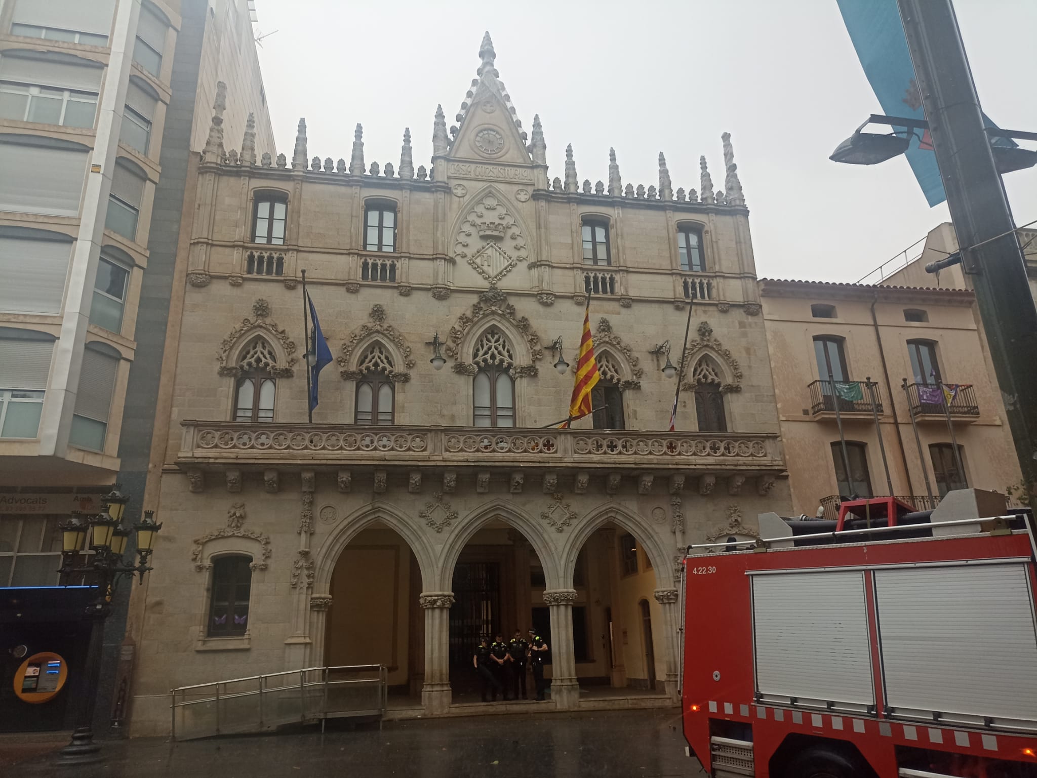 Els Bombers de la Generalitat han actuat aquesta tarda per un avís de perill per caiguda d’un dels pals de bandera de l’Ajuntament de Terrassa. Concretament, el pal que aguanta la bandera espanyola ha caigut, i corria el risc de caure al Raval de Montserrat. Tampoc ha resistit la bandera de Terrassa, que tot i que es manté enganxada, ja no oneja. Al mateix Raval, els Bombers també han hagut d’actuar a l’edifici del costat, sobre l’oficina bancària de la Caixa, per sanejar la façana per risc de despreniment.