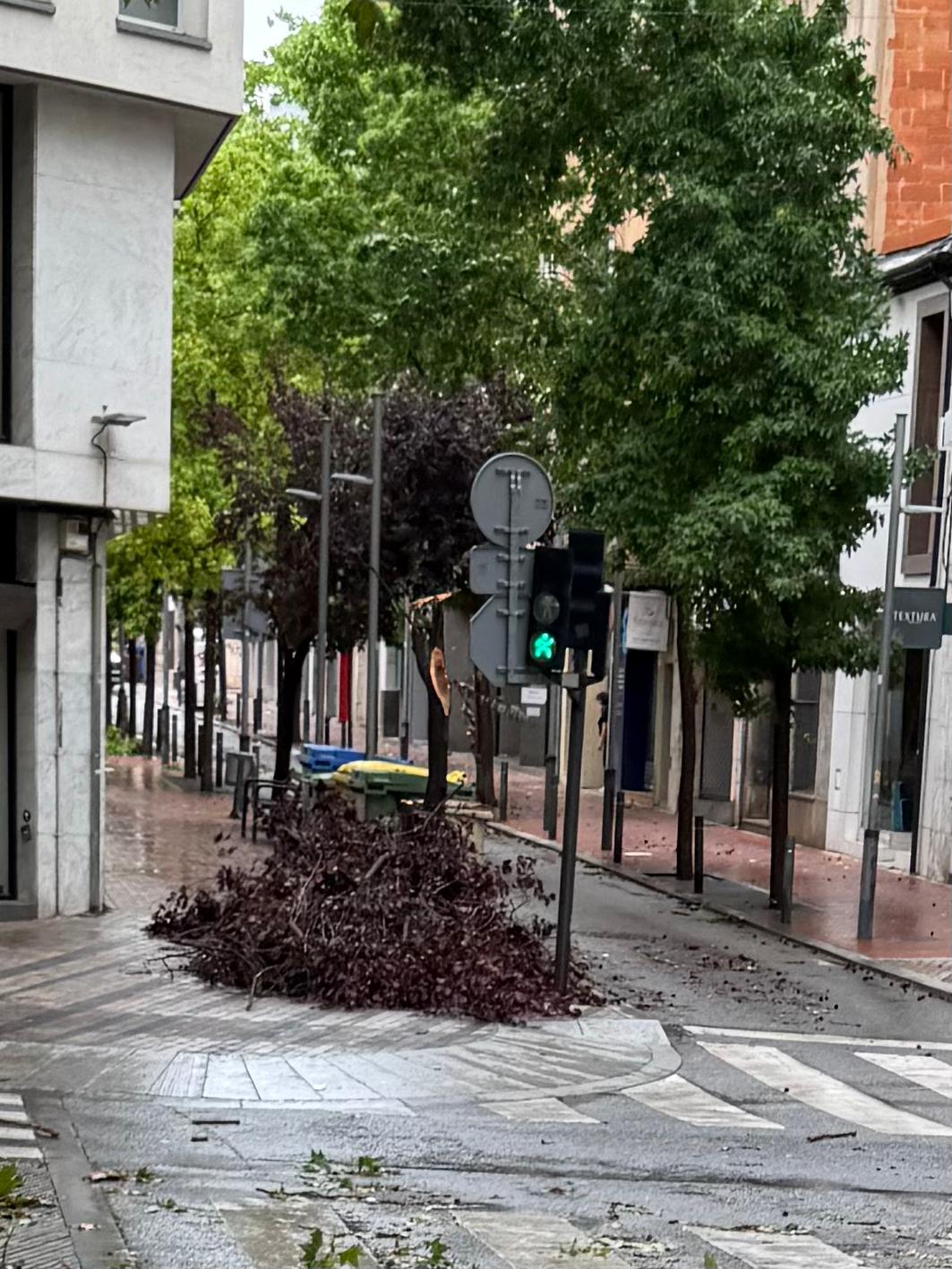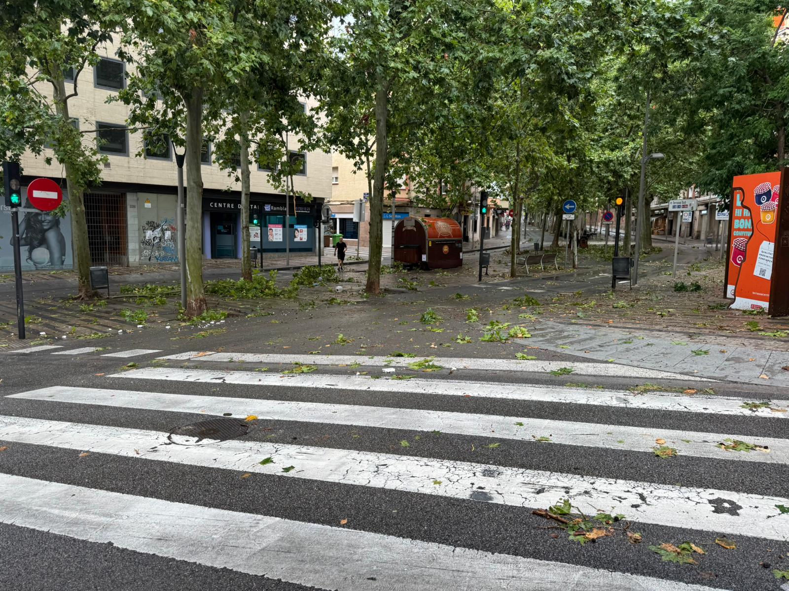La Rambla d’Ègara ha estat una de les zones on més ha patit les ratxes de vent. Han caigut diverses branques d’arbres i fulles deixant una catifa de verd a banda i banda.